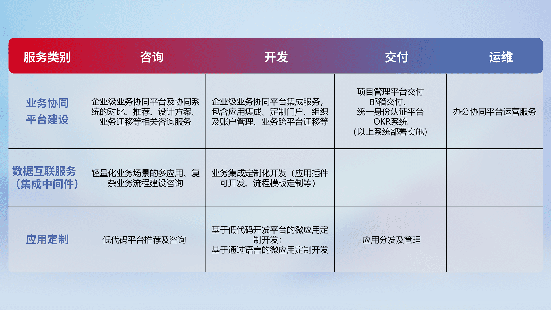 针对钉钉、、企微、、、IDaas等平台级产品提供产品的规划、、、方案、、、交付、、、、定制化开发等服务,,,实现如统一协同办公、、、智能客户服务、、混合会议管理、、、、智能数据查询、、、等业务场景,,实现数字化转型。。。