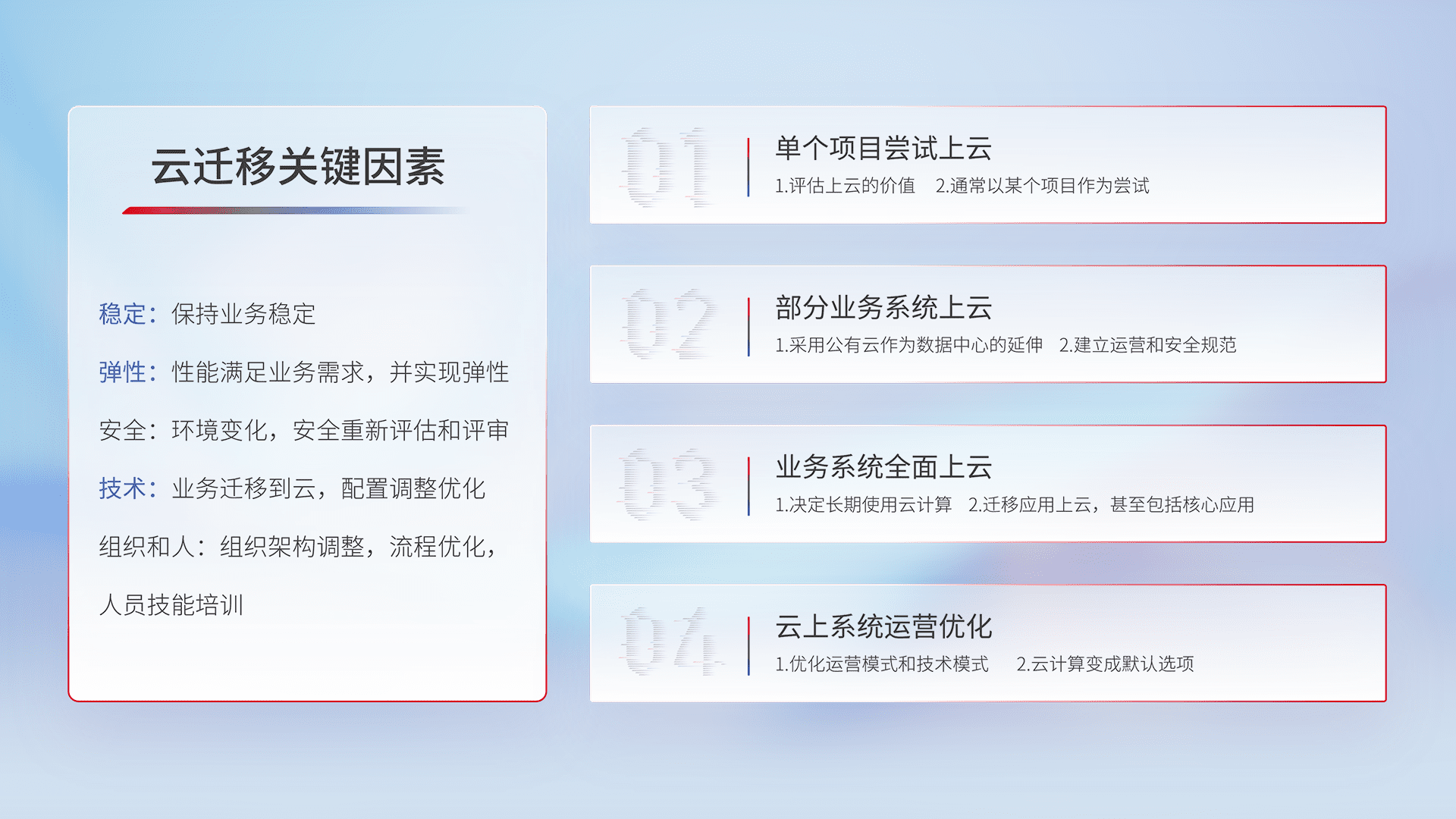 结合实际业务,,从规划设计、、、云平台选型、、云原生改造、、、数据迁移、、、集成交付,,,迁移全过程为客户识别最佳上云路径,,做好风险识别管理,,,设计网络架构、、身份权限、、、、安全审计合规、、操作审计、、、日志审计、、监控告警策略、、多站点容灾设计等,,,,对云上基础设施进行整体规划,,,提升IT治理水平,,,,以满足弹性、、、高可用、、高性能的需求。。。